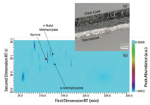 Figure 2: (a) Cross-section of automotive paint system, (b) Py-GC×GC-MS profile of the clear coat.