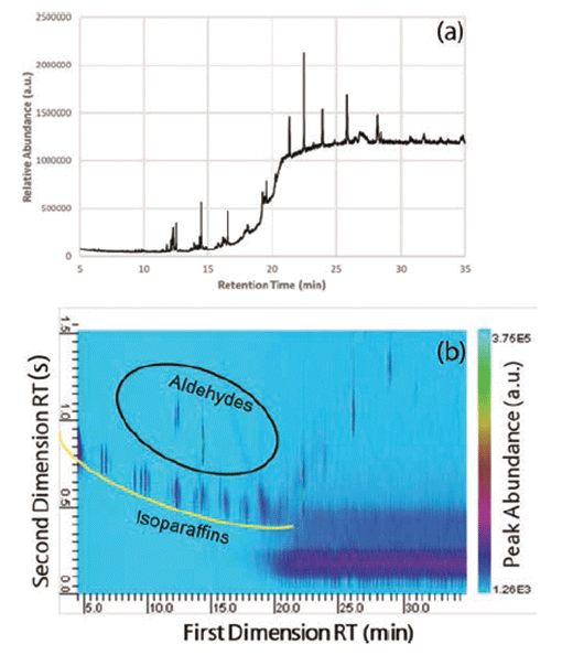 Figure 1: (a) GC–MS and (b) GC×GC–MS of an oil-based lubricant.