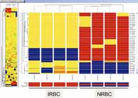 Figure 4: Hierarchical cluster analysis organized the replicate samples into two distinct clusters based on the similarity of entities' abundance profiles for the NRBC and IRBC conditions. Clustering analysis by entity profiles across sample groups allows for the grouping together of compounds that have similar abundance profiles. This may reveal interesting relationships, as entities that exhibit similar behavior across a set of experimental conditions may share similar reaction pathways.