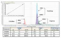 Figure 6: LCâMS-MS analysis of pH 7 extracted metabolite samples on a polar silica hydride column confirms the LCâTOF results. The MRM transitions for arginine, citrulline, and ornithine are displayed. Standard curves (inset) were built across a wide dynamic range (five logs), which enabled the estimation of the concentrations for each compound in each RBC sample. The amounts of each compound extrapolated from the calibration curves are shown in the table for each sample group, along with the standard deviation (SD), extrapolated concentration in 1 mL of cell extract, and the fold change in the amount of each metabolite, NRBC vs. IRBC.