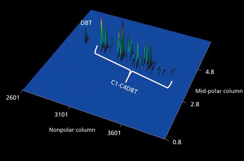 LCO and VGO samples were diluted in dichloromethane (100:1 and 10:1) and 0.5 mL aliquots were placed in 2-mL vials. Data acquisition was carried out using an Agilent 7890 gas chromatograph with a split–splitless injector, a Gerstel MPS2 autosampler, and a LECO Pegasus GC-HRT 4D MS system. The GC system was equipped with a secondary oven, a liquid nitrogen quad-jet, a dual-stage thermal modulator (LECO Corporation) and a dual capillary column set (Restek Corporation): column 1: a nonpolar 30 m x 0.25 mm, 0.25-µm df Rxi-5ms; column 2: a mid-polar 0.6 m x 0.25 mm, 0.25-µm df Rxi-17Sil MS.