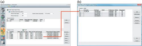 Figure 3: ChromaTOF-HRT (a) target analyte finding list and (b) HRAM ion list.