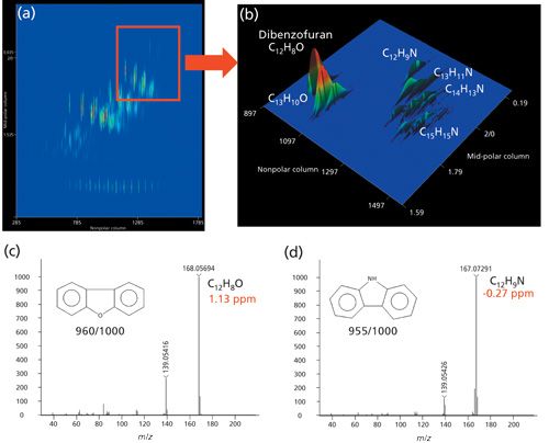 Figure 2: (a) Contour plot (TIC) and (b) expanded surface plot (XIC) displaying oxygen and nitrogen compounds in LCO. Peak true mass spectra for (c) dibenzofuran and (d) carbazole.