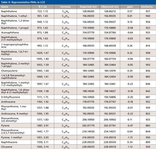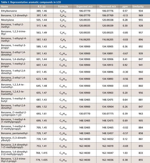 A significant improvement in comprehensive LCO and VGO sample characterization was achieved through coupling 2D GC with high-resolution TOF-MS. Comprehensive processing of the LCO data resulted in confident identification of alkanes, cycloalkanes, aromatics (mono-, tri-, tetra-), and heteroatomic compounds through a combination of spectral similarity searches and robust formula determinations using high-resolution accurate mass (HRAM) ions. For example, Tables I and II list retention times, formulas, expected and observed molecular ion m/z values, mass accuracy values, and spectral similarity search results for representative sets of aromatic and polyaromatic hydrocarbons (PAHs). The average spectral similarity value for the aromatic hydrocarbon set was 903/1000 and 904/1000 for PAHs. Average absolute mass accuracy values for these sets of compounds were 0.43 and 0.36 ppm, respectively.
