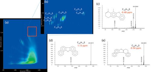 Figure 5: VGO (a) contour plot, (b) contour plot expansion showing higher molecular weight sulfur-containing compounds (C17H12S to C20H14S) and (c–d) peak true mass spectral data with molecular ion mass accuracies for naphthenic benzothiophenes.