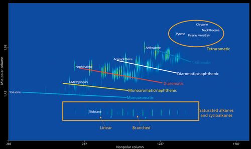 The combination of enhanced chromatographic resolution (GCxGC), increased resolving power of high-resolution TOF-MS, and software designed to leverage these attributes resulted in data that were easy to process and interpret. Superlative structural characterization of low to mid-level petroleum fractions was facilitated by the production of high quality spectral data obtained with unmatched spectral acquisition rates for proper chromatographic peak definition. Confident molecular identifications were made via spectral similarity and formula searches of high-resolution accurate mass data. In addition, rapid speciation of various compound classes was accomplished through retrospective analysis of comprehensive GCxGC–high-resolution TOF-MS data using TAF.