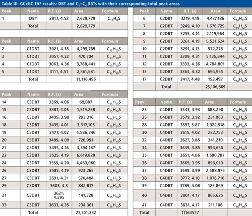 The results of TAF for dibenzothiophene (DBT) and alkylated dibenzothiophene (C1–C4 DBT) in VGO are displayed on the surface plot in Figure 4. The peak numbers, names, retention times, areas, and formulas for dibenzothiophenes meeting the TAF criteria are listed in Table III.