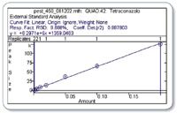 Samples containing a mixture of 212 pesticides were analyzed. List of the pesticides tested is shown in Figure 1. The rapid determination of all 212 pesticides was achieved with a single injection, monitoring at least two MRM transitions for each analyte to satisfy the SANCO quality control procedures. Figure 2 shows the full target ion chromatogram (TIC) for the 212 pesticides. Figure 3 shows a typical calibration curve for one the pesticides measured (tetraconozole).