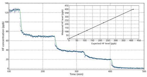 In the past, the use of capacitive (condenser) microphones was a limitation in sensitivity and also presented issues of nonlinearity. As microelectrical-mechanical system (MEMS) microphones have advanced, driven largely by widespread adoption in cell phones, these have enabled large improvements in sensitivity and linearity. In particular, Gasera has adopted a patented cantilever MEMS microphone design for all of their photoacoustic spectroscopy offerings. A laser interferometer is used to read the displacement of the MEMS-fabricated cantilever to high accuracy. This microphone design has allowed detection limits of low- or sub-parts-per-billion levels for a variety of gases. Figure 2 shows the measurement of a time-varying concentration of hydrofluoric acid (HF) over time with a photoacoustic instrument equipped with a QCL laser.