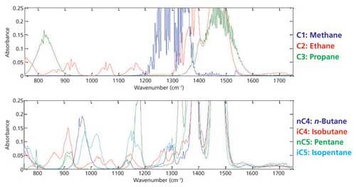 Quickly after their invention, commercial Fabry-Perot QC lasers became available, and in 2004, distributed feedback QCLs were available, which allowed single-mode operation. These have been shown to be tunable to nearly 1% of their center wavelength. However, a big jump in the capabilities of QCLs came in 2006, when Daylight Solutions introduced their external cavity QCL system. This system, and similar systems from Block Engineering, can tune QCLs from 10% to 15% of their center wavelength. Several hundred wavenumbers of tuning range in the IR allows interrogation of multiple target analytes with a single laser device. Because QCLs are in the mid-IR, the transitions that they access are typically the fundamental vibrations, rather than the weaker overtone transitions that are accessed in the near-IR by TDLAS. Figure 3 shows an example of hydrocarbons measured in the mid-IR “fingerprint region” using a QCL. This busy spectrum shows unique features of these C1–C5 hydrocarbons, which can be easily quantified. Measurements of individual hydrocarbons and the distribution of C1–C5 hydrocarbons are both important in refining applications, among others. The high spectral irradiance of the QCLs results in a combination of overall measurement speed (10 Hz) and detection limits (typically low parts-per-million level) that can be a real benefit for industrial or real-time applications.
