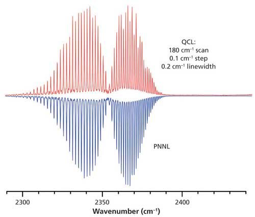 QCL devices were first packaged singly, and presently both Block Engineering and Daylight Solutions have products that combine up to four QCLs in a single device. In these devices, the lasers are combined into a single collimated output that can provide high power (multiwatt) and mode-hop-free tuning over a substantial range, typically 250+ cm-1 per laser and thus up to 1000 cm-1 per device. This high speed tuning (tens of milliseconds over the range), combined with high spectral brightness, has benefits for many applications. The lasers can operate in pulsed or continuous wave (CW) modes, allowing different averaging and sampling strategies to fit the application. Figure 4 illustrates a CO2 spectrum taken in pulsed mode with a QCL device, with the resulting spectrum (top) compared with the database spectrum from the Pacific Northwest National Laboratory (PNNL). Line positions and overall spectral shape are very accurately reproduced. In pulsed mode, scan rate and step size can be adjusted, and averaging is user-determined. QCL systems can also be used for isotope determination in carbon, which can be important in energy exploration applications.