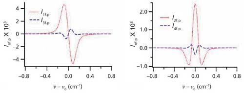 A lock-in detector then compares the modulation current with the laser drive current, detecting signals at the fundamental frequency f and also the harmonic frequencies 2f, 3f, and so forth. Typical signals are shown in Figure 1, where the x-axis represents the difference between the laser center frequency and the center of the absorption transition being probed, and the y-axis is the relative intensity of the detected signal. Such signals look like derivatives of the absorption line (which may be more Gaussian or Lorentzian depending on pressure, and which is typically fitted with a Voigt profile), with the number of the harmonic corresponding to the appearance of the corresponding first, second, and so on, derivatives. In practice, second harmonic signals are typically used for measurements because they have a zero background.