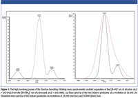 Experimental results demonstrate that UHPLC improves chromatographic resolution, speed, and sensitivity, and when coupled to MS, it facilitates rapid, high-throughput analysis of challenging samples. Using UHPLC single-stage orbital trap MS, a mixture of 510 pesticides representing a broad spectrum of chemical classes was separated and detected within 12 min. High resolution (50,000) and high mass accuracy (< 5 ppm without internal calibration for most compounds) enabled identification of all analytes. Separation of isobaric pesticides was achieved only at the high resolving powers provided by single-stage orbital trap MS, as demonstrated in Figure 1.
