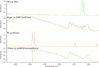 A major point of these analyses is to measure the amount of lipid in the algae samples using infrared spectroscopy. The analytical method described in the Pistorius publication uses the spectral features in the C-H stretching region to determine the lipid content. However, the spectral features from the polyethylene film are very similar to those from lipids, creating a large cross interference problem. The PTFE polymer shows no interference in the C-H stretch region and has no features in the amide or carbonyl regions, although the strong infrared peak for PTFE near 1200 cm-1 results in some spectral distortion near the region employed for the carbohydrate analysis. Figure 3 shows spectra from the two polymer films and from algae samples after subtraction of the spectra from the reference films. Although some spectral artifacts are observed from the polymer, the use of microporous polymer film as a sample substrate would result in a very low cost disposable sampling system.