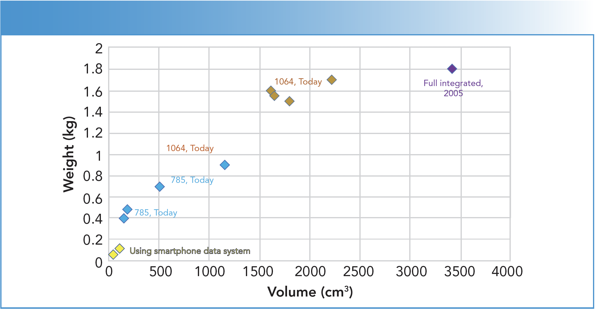 FIGURE 2: Size and weight of handheld Raman instruments from 2005. The purple marker in the top right represents the first fully-integrated system. The two yellow markers on the bottom left represent spectrometers that do not have an embedded data system, but communicate to a smartphone for control, data display and work-up. The earlier briefcase-sized instruments are not included in this plot.