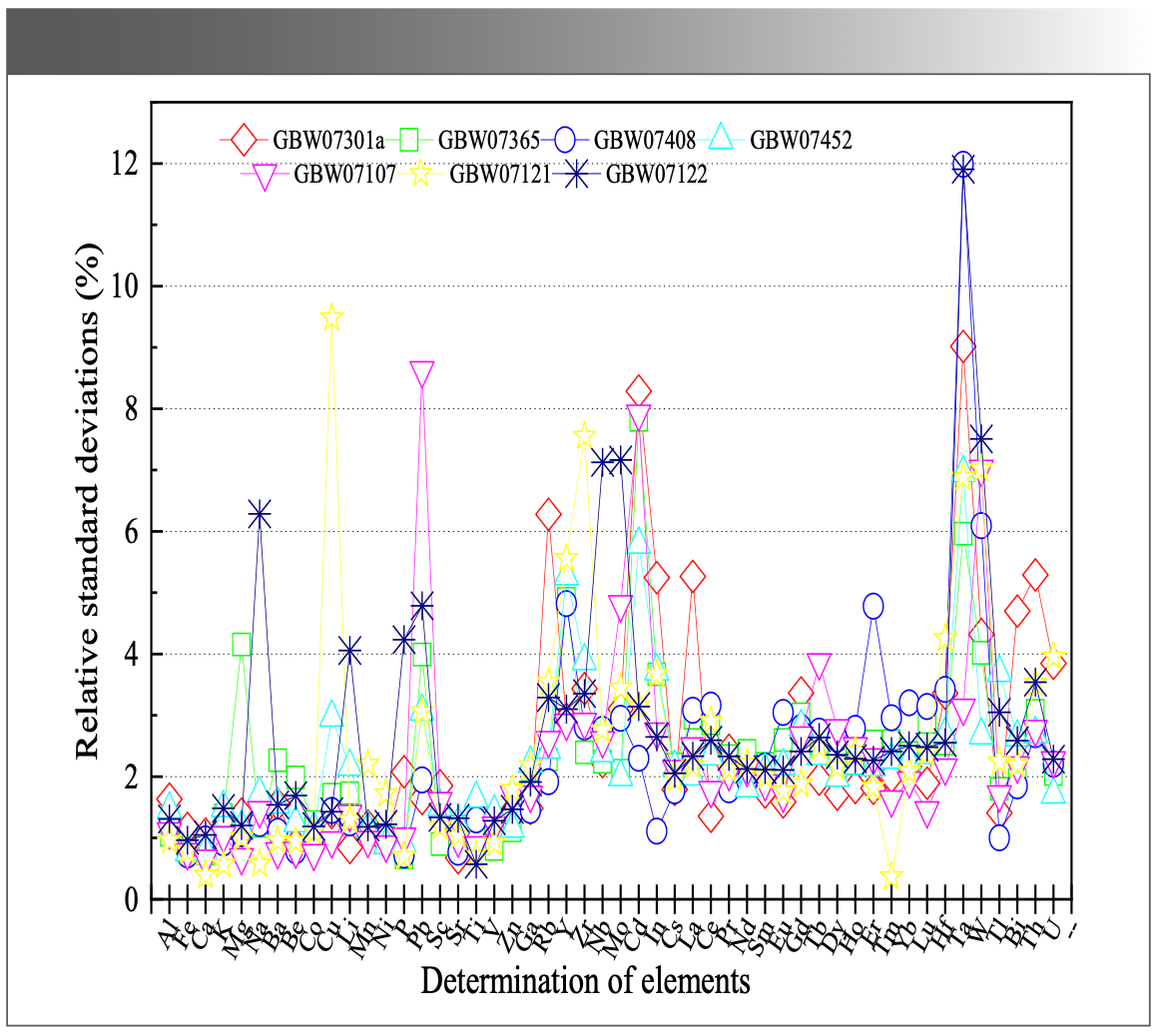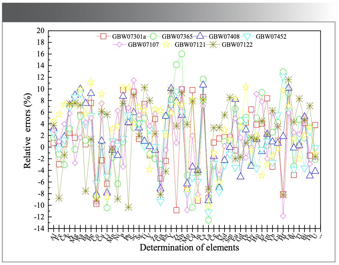 According to the sample preparation method, the solutions of certified reference materials for stream sediment (GBW07301a and GBW07365), soil (GBW07408 and GBW07452), and rock (GBW07107, GBW07121 and GBW07122) were prepared for 10 parts respectively, and the 51 elements for solutions were detected. The results are presented in Table Ⅴ, and they show that the analytical results are in agreement with the certified values. The precision of the method is shown as the relative standard deviation (RSD) in Figure 4. The RSD in this study is lower than 10% for most elements, except for element Ta in GBW07408 and GBW07122, which are 11.98% and 11.91%, respectively. The accuracy of the method is shown as the relative errors (RE) in Figure 5. It can be seen from Figure 5, the RE in our study are all within the range from -13% to 13% for most elements, except for element Nb in GBW07365, which is 16.03%. The results exhibited good precision and accuracy of the method for all studied elements.