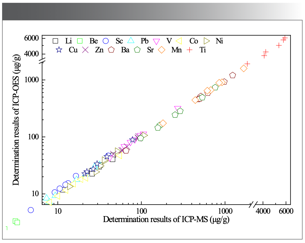 The linear dynamic range of ICP-MS and ICP-OES are mg/g to ng/g and x% to 0.0x mg/g, respectively. Therefore, the contents of Ti, V, Mn, Ba, and Sr vary greatly, and the contents of Li, Be, Sc, Co, Ni, Cu, Zn, and Pb vary little in the certified reference material of GBW07301a, GBW07365, GBW07408, GBW07452, GBW07107, GBW07121, and GBW07122 determined simultaneously by ICP-MS and ICP-OES. Figure 1 reveals a good correlation between ICP-MS measured values and ICP-OES measured values.