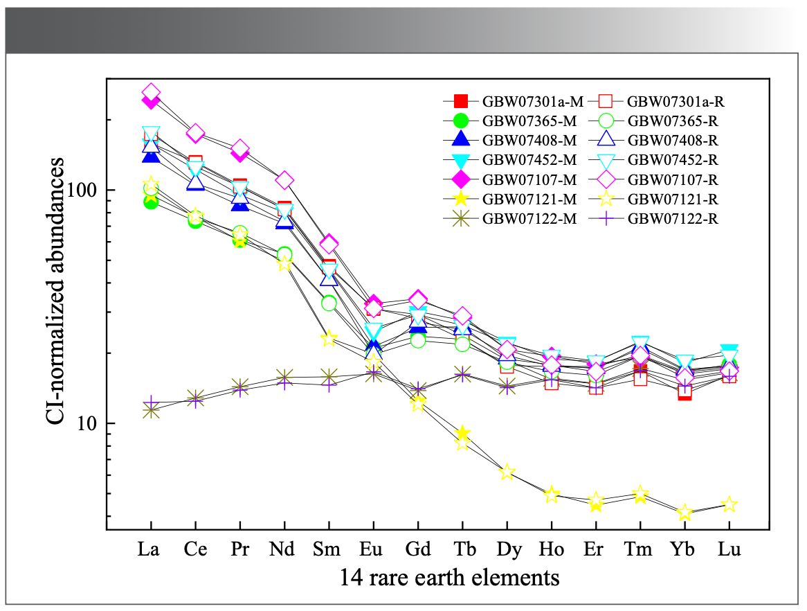It is widely known that REEs refer to lanthanide elements (La–Lu) in the periodic table. Two adjacent REEs have different abundances, and their graph of atomic number vs. REEs abundance shows a zigzag pattern. However, chondrite-normalized REEs patterns can eliminate the zigzag pattern and form a smooth curve for REEs, with no significant relative depletions, except for elements Ce and Eu, which would have abnormal behaviors because of the different in valency (Eu[Ⅱ] and Ce[Ⅳ]). Figure 2 shows CI-chondrite normalized REEs abundances for the seven certified reference materials (16), exhibiting smooth chondrite-normalized REE patterns, indicating that our ICP-MS data are reliable.