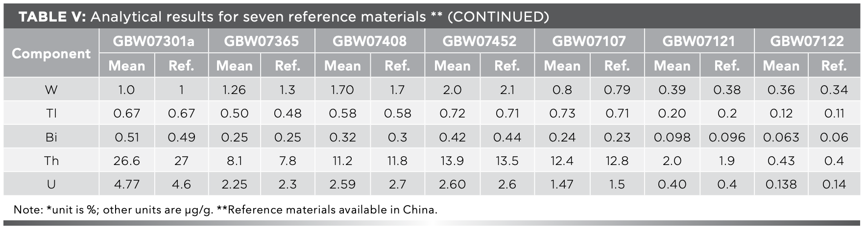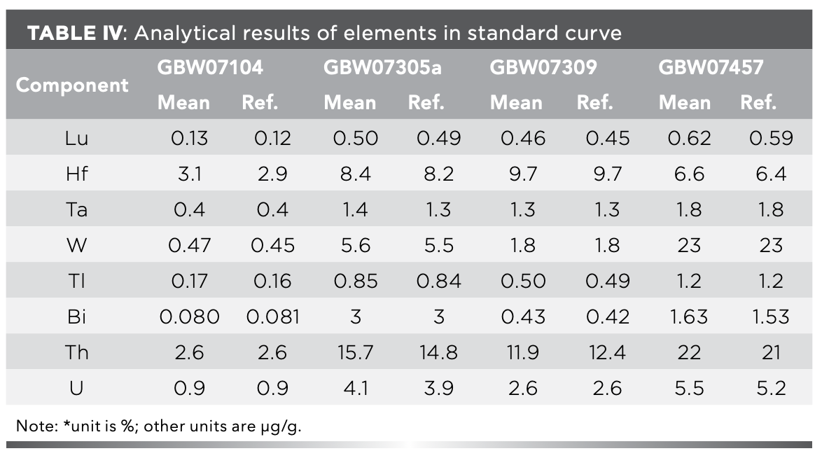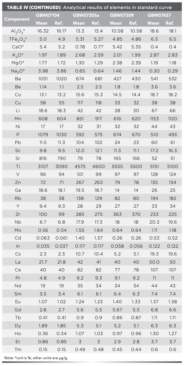 In addition, the standard solution for drawing the standard curve was prepared by using the certified reference materials GBW07301a, GBW07309, GBW07457, and GBW07104 dissolved simultaneously with the samples. This not only ensures that the acidity and matrix element content of the standard and sample are consistent, but it also eliminates the effect of different injection transfer efficiencies caused by different viscosities of solution. Therefore, the matrix effects in the determination of ICP-OES and ICP-MS were further eliminated, and the results were significantly improved. Analytical results of elements using the standard curve are listed in Table Ⅳ.