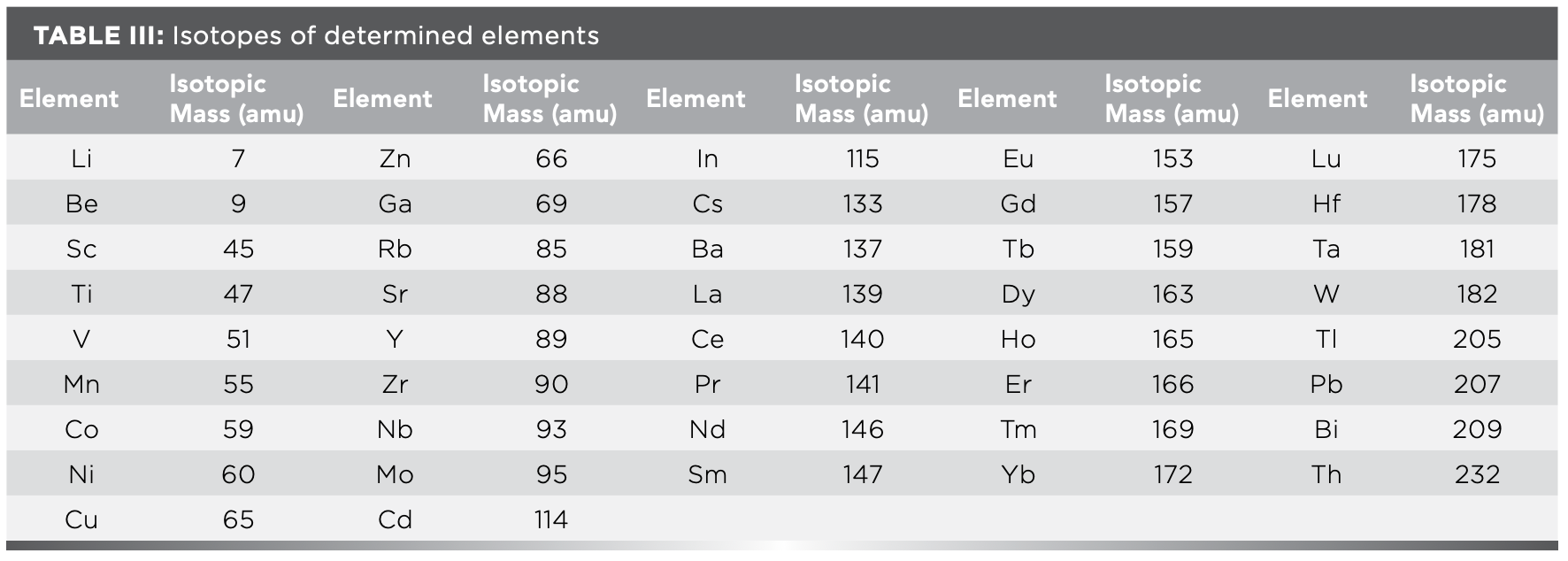 Theoretically, ICP-MS has good selectivity and strong anti-interference ability. However, because of the complexity of geological samples, there are many interferences in ICP-MS analysis, including interference of polyatomic ions, isotopic interference, and matrix effect issues. The interference of polyatomic ions is particularly serious; for example, the interference of light rare earth oxides and hydroxides on heavy rare earth elements, and the interference of oxides of Ba, Ca, and Ti on transition elements. Therefore, during the analysis by ICP-MS, the isotope of element, with less interference, high abundance, and high signal intensity is chosen as the analytical element. The optimal isotopes of determined elements are listed in Table III. At the same time, 185Re (10 μg/L) and 103Rh (10 μg/L) in geological samples were selected as internal standards, and the recovery was controlled within the range of 100% ± 20%, which effectively compensated for the measurement deviation caused by matrix effects.