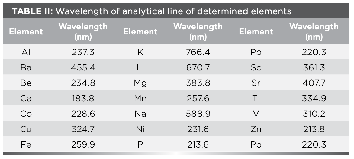 The spectral interference and matrix effect are the main influencing factors in ICP-OES determination. To eliminate matrix effects and spectral line interference, it is necessary to accurately select the analytical spectral lines of each element to be measured. The selection of spectral lines depends on the content of elements; coexistence interference and linear range are mainly considered for major elements, and the detection limit, co-existing interference, and background interference are mainly considered for minor and trace elements (8). Rich characteristic lines of each element are provided in the ICP-OES software. Therefore, the performance of the instrument was used to determine 2–3 selected spectral lines of each element, the background was deducted, and the emission intensity, detection limit, interference of coexisting elements, and linear range of each spectral line were analyzed by an automated function of ICP-OES software. The best spectral line was chosen as the analytical line for analysis. These optimal spectral lines are listed in Table II.