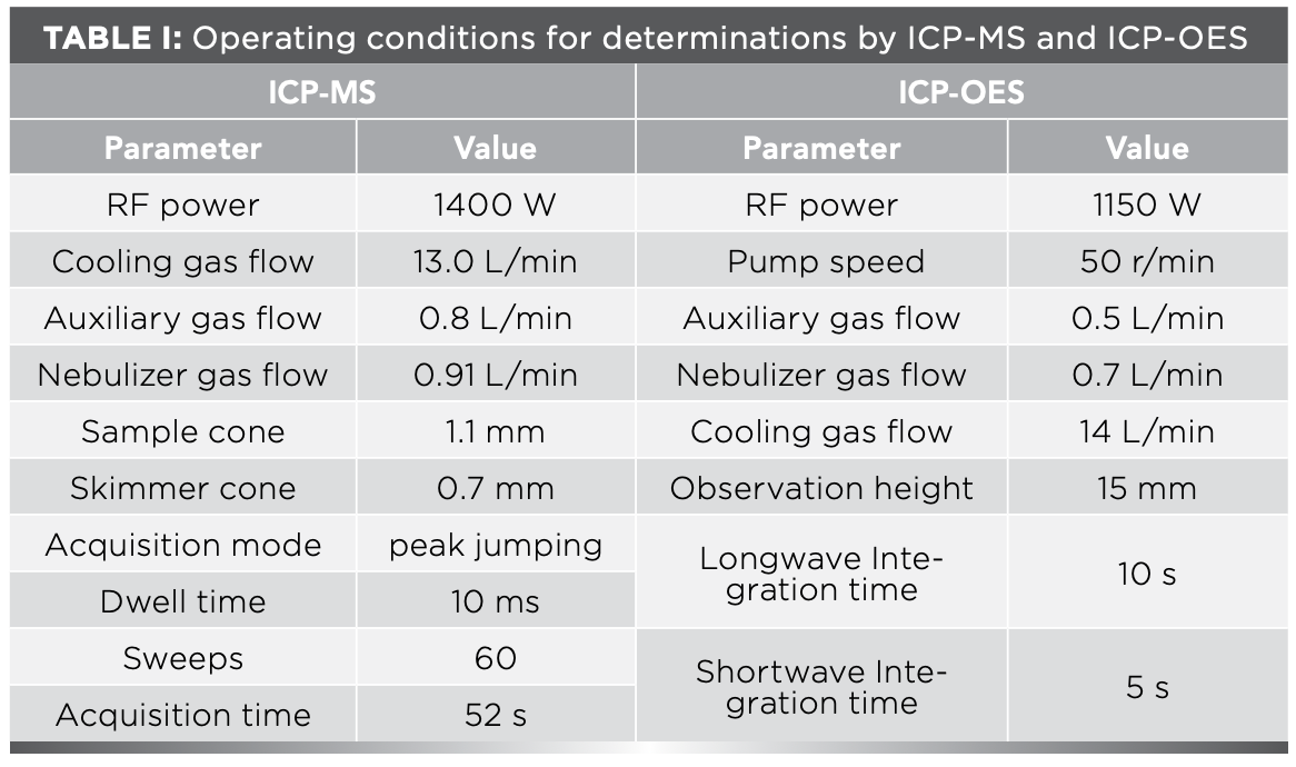 The experiments were made using a quadrupole ICP-MS X series II (Thermo Fisher Scientific) and a iCAP6300 ICP-OES instrument (Thermo Fisher Scientific). Details of the instrument operating conditions and parameters are summarized in Table I.
