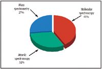 Molecular spectroscopy techniques account for over 41% of the spectroscopy market, although many diverse techniques are represented that address a wide range of applications in almost every industry category. Atomic spectroscopy is the second largest sector at almost 32%, while mass spectrometry represents about 27% of spectroscopy revenues. Please note, that in this year's presentation, we have included single stage mass spectrometers. These are the mass detectors associated with general purpose liquid chromatography–mass spectrometry (LC–MS) and gas chromatography–mass spectrometry (GC–MS) instruments. Previously, this portion of the MS market was not counted as it was considered a chromatographic technique. Accordingly, MS techniques now account for a greater percentage of the spectroscopy market (27% versus 20%). On the other hand, the liquid and gas chromatographic portions of LC–MS and GC–MS are included in the revenue estimates.