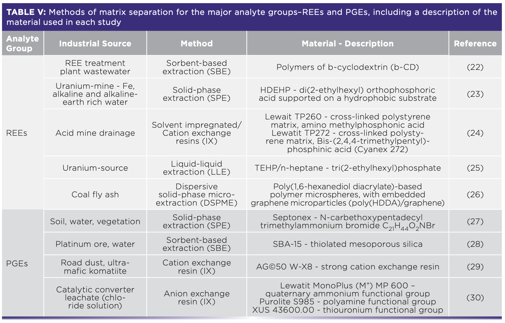 There are various methods available for avoiding matrix effects. These include 1) sample dilution, if the analytes are in a high enough concentration in solution; 2) matching matrix concentrations in the calibration solutions; 3) the use of internal standards (Ru, Re, and Ca for REE [13,14], Se for As [18], and Ru, Ir, In, and Au for PGEs [19]); 4) increasing plasma temperature; and 5) lowering nebulizer flow (15). Analytes can also be separated from their matrix and preconcentrated in the sample. This has been a well-explored alternative for improving REE and PGE determination by ICP-MS. Techniques here can be classified as liquid–liquid extraction (LLE), sorbent-based extraction (SBE) including solid-phase extraction (SPE), and chelating and ion exchange (IX) resins (19–21). Table V shows a selection of matrix separation methods and materials used for REEs and PGEs from industrially-sourced samples followed by ICP-MS, ICP-OES, or other AS analytical techniques.