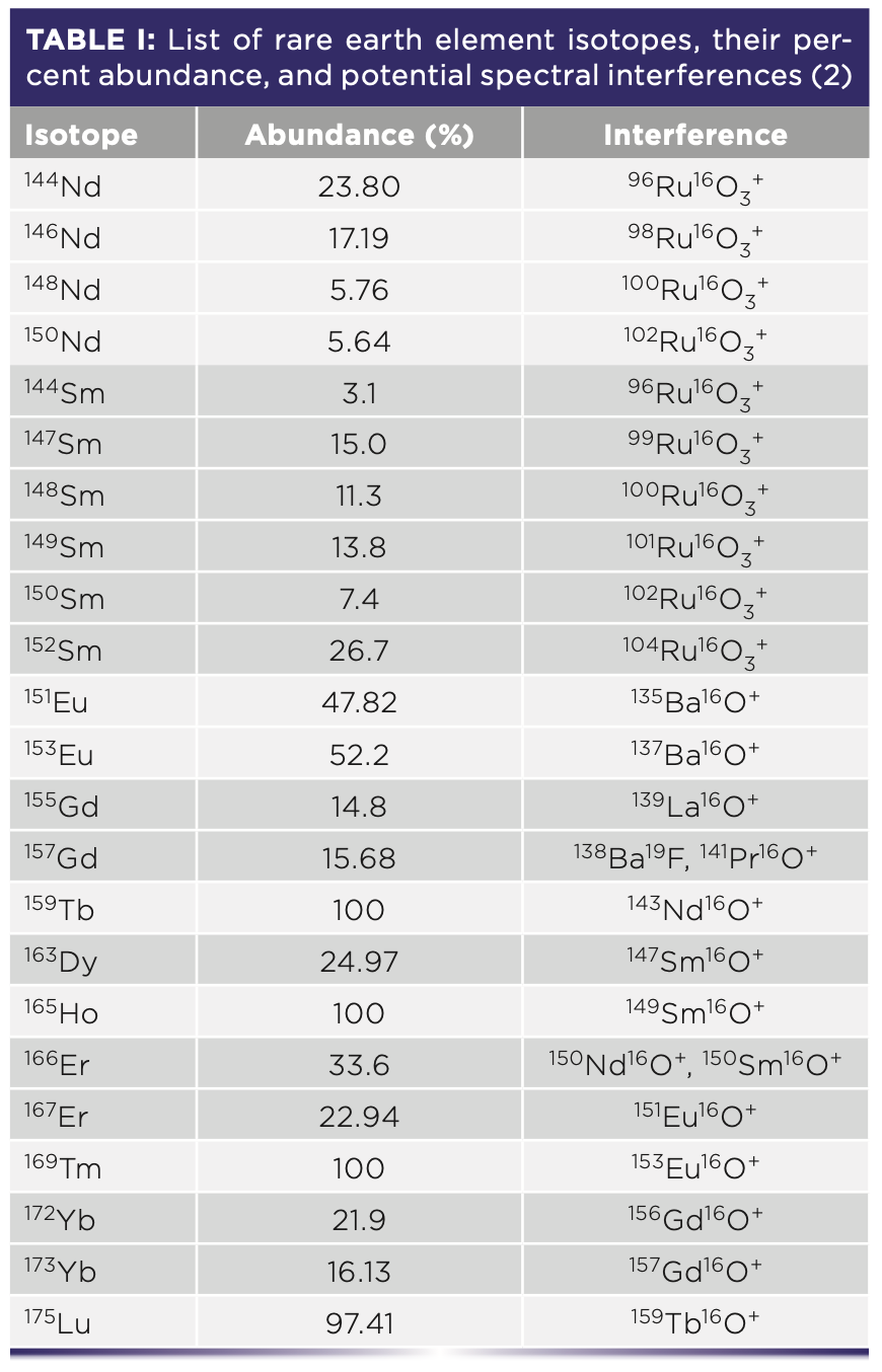 For the analysis of REEs by ICP-MS, often preferred over ICP-OES because of lower detection limits, there are certain spectral interferences that cause problems for the quantification of individual REEs as well as for the full suite. REEs form strong metal oxide bonds (MO+) and metal hydride bonds (MH+) (1). The MO+ ions from lower mass REEs will overlap in their m/z ratio with the isotopes of higher mass REEs (Tb-Lu). A list of the common REE interferences from MO+ ions is shown in Table I.