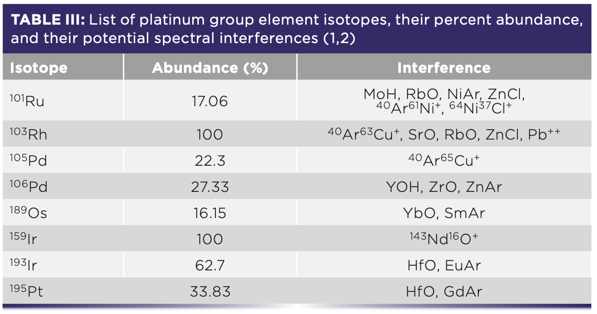 The major issues of spectral interference for PGEs include the overlap of HfO+ ions with Pt, of ZrO+, YO+, SrO+, MoO+, and Cd isotopes with Pd, and of Pb, ArCu+, RbO+, and SrO+ isotopes with 103Rh (8). Additionally, hydride, argide, and chloride interferences are problematic for individual PGEs (Table III).