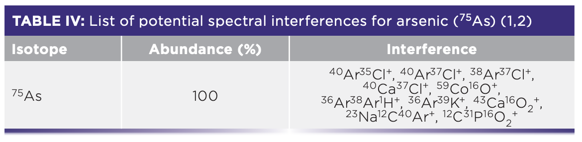 Although graphite furnace atomic absorption spectrometry (GFAAS) is a robust and reliable AS technique for As, ICP-MS might be preferred in these cases because it allows for the determination of multiple elements in one sample run. There are a number of possible spectral interferences occurring for As analysis by ICP-MS (Table IV).