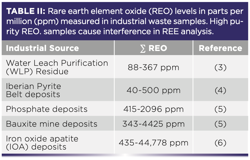 For the most reliable determination of the full suite of REEs in a high REE-oxide matrix, single quadrupole or triple/multi quadrupole ICP-MS (ICP–QQQ) is used. The concentrations of lower mass REEs (La, Ce, Nd, Sm, Gd, Tb, and Lu) can reliably be determined by using the O2 mass-shift mode, whereas the NH3 cell gas mode is better for higher mass REEs (Pr, Eu, Dy, Ho, Er, Tm, and Yb) (1). Interferences from high REE-oxide purity samples is a relevant factor for a variety of industrial waste products (Table II).
