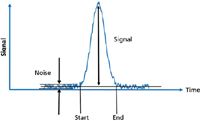 The measurement of the "signal" is generally accepted to be the height of the maximum of the chromatographic signal above the baseline (Figure 1). However, some of the changes in GC–MS S/N specifications have been artificial. The industry standard for GC–electron ionization (EI) MS has changed from methyl stearate, which fragments extensively to many lower intensity ions, to compounds that generate fewer, more intense ions, such as hexachlorobenzene (HCB) and octafluoronaphthalene (OFN). The change to OFN held a secondary benefit for noise: the m/z 272 molecular ion is less susceptible to baseline noise from column bleed ions (an isotope of the monoisotopic peak of polysiloxane at m/z 281 increased baseline noise for HCB at m/z 282).
