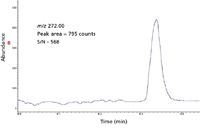 The situation becomes even more indeterminate when the background noise is zero, as shown in the MS-MS chromatogram in Figure 3. In this case, the noise is zero and S/N then becomes infinite. The only "noise" observed in Figure 3 is because of the electronic noise, which is several orders of magnitude lower than noise because of the presence of ions in the background. This situation can be made more severe by increasing the threshold for ion detection. Under these circumstances, it is possible to increase the ion detector gain, and hence the signal level, without increasing the background noise. The signal of the analyte increases, but the noise does not. This is obviously misleading since the signal increased, but there was no increase in the number of ions detected, and therefore, no change to the real detection limit. This allows S/N to be adjusted to any arbitrary value without changing the real detection limit.