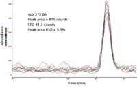 Figure 4: EI full-scan extracted ion chromatograms of m/z = 272 from 200 fg OFN, eight replicate injections, 3.3 Hz data rate.