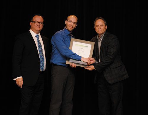 Algar receiving the Fred Beamish Award (sponsored by Thermo Fisher Scientific) from Mark James of Thermo Fisher Scientific. At left: Canadian Society for Chemistry (CSC) President Rui Resendes. (Photo courtesy of CSC, specifically Gale Thirlwall.)