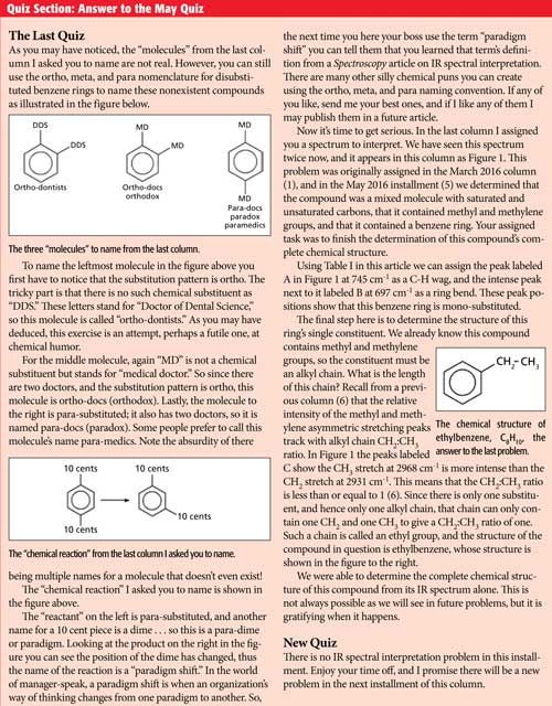 In the last installment (1), we discussed how to distinguish mono- and disubstituted benzene rings from each other. We used the position of the aryl C-H out-of-plane bending vibration (“C-H wag”) between 1000 and 700 cm-1, and the presence or absence of the intense ring bending peak at 690 ± 10 cm-1. This information is summarized in Table I.