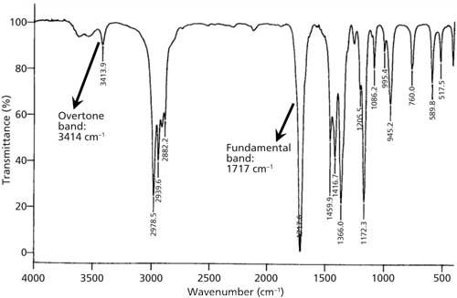 An overtone band is the result of any spectroscopic transition from v = 0 to v = 2,3,4 . . . or higher. An example of an overtone transition is shown in Figure 2. The “first overtone” involves a v = 0 to v = 2 transition, and falls at about twice the wavenumber of the fundamental. Figure 3 shows the IR spectrum of methyl ethyl ketone with examples of a fundamental and overtone band labeled. Note that the overtone is about 10 times less intense than the fundamental. In general, overtone bands are 10–100 times less intense than fundamental bands (4). Thus, only overtones of very intense fundamentals will typically appear in IR spectra. For fundamentals above 2000 cm-1 their overtones will mostly appear above 4000 cm-1 in the near-infrared (NIR) part of the electromagnetic spectrum. Since overtones are weak they are generally not diagnostically useful IR features.