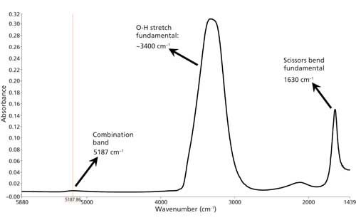 The water spectrum exhibits a scissors bending fundamental at 1630 cm-1, and an O-H stretch fundamental at ~3400 cm-1. The combination band, because of the excitation of both these vibrations at the same time, is at 5187 cm-1. Note how small the combination band is compared to the fundamentals. Also note that this combination band is in the NIR. Many NIR features are overtone or combination bands. Because they are not intense, combination bands are generally not diagnostically useful.