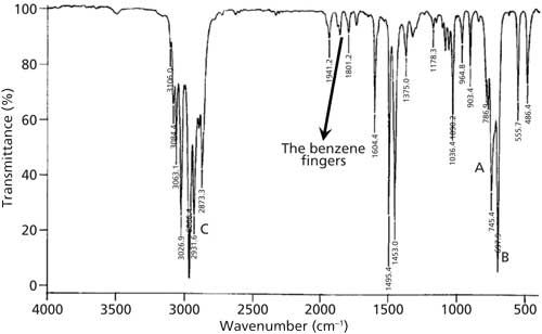 The benzene fingers are a series of overtone and combination bands, which at this point will not mean much to you since we have not defined these terms. That is the purpose of the next section.