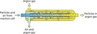 The AsO3 and GeO2 nanoparticles agglomerate with NH4NO3 in the reaction cell to form particles too large to pass through the porous membrane of the GED. As the gas with suspended particles travels along the inner tube of the GED, atmospheric gases are replaced with argon via diffusion across the membrane. Ultimately, before the sample enters the plasma, the atmospheric gases have been replaced by argon and the particulate matter resulting from the gas or air sample remains. The NH4NO3 particles are easily dissociated in the argon plasma into their constituent ions while the As2O3 and GeO2 provide a stable signal suitable for quantification by ICP-MS.