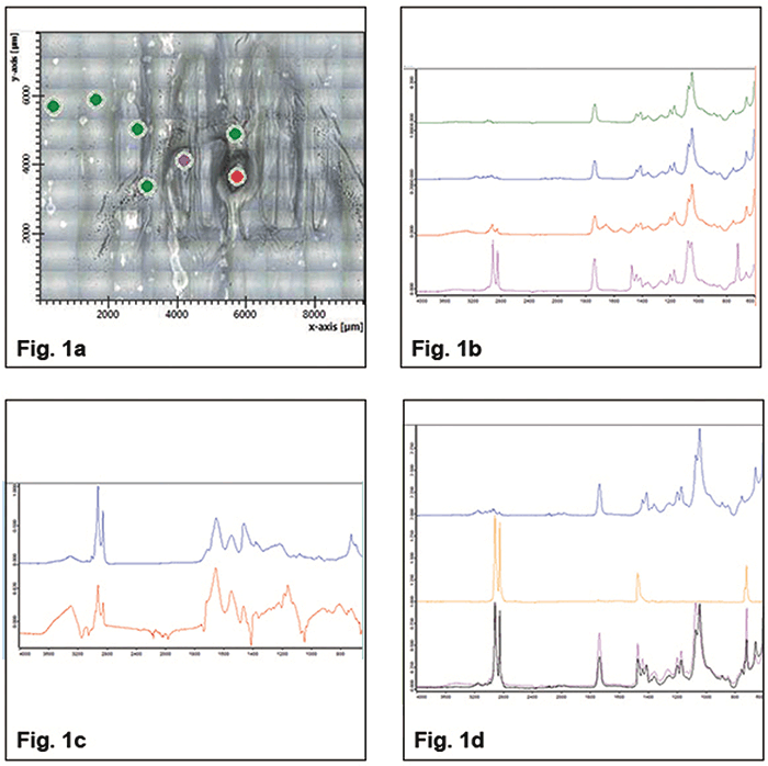 A transparent packaging film with included defects was analyzed. Measurement positions were selected to target the defects and other areas of interest on the intact film (Figure 1a). The automated data collection was performed using the ATR mode with an acquisition time of 20 s/spectrum and at a spectral resolution of 4 cm-1. The film was identified as polyvinylidene chloride acrylate copolymer by spectrum search in the comprehensive ATR COMPLETETM library (Figure 1b). The spectra collected from the defective area (red label) also showed the spectral signature of the basic film, but additional bands were also evident. The search function in OPUS automatically removed the film spectrum yielding the spectrum from the unknown contaminant. If the result of a spectrum search accounts for some, but not all of the bands of the query spectrum an automatic subtraction of the reference library spectrum and search of the residual spectrum is be performed with a single mouse click. In this case, the red labeled spot clearly showed that the additional component was a polyamide resin (Figure 1c). The second contaminant (labeled pink) was determined to be polyethylene (Figure 1d) after subtraction of the base film spectrum.