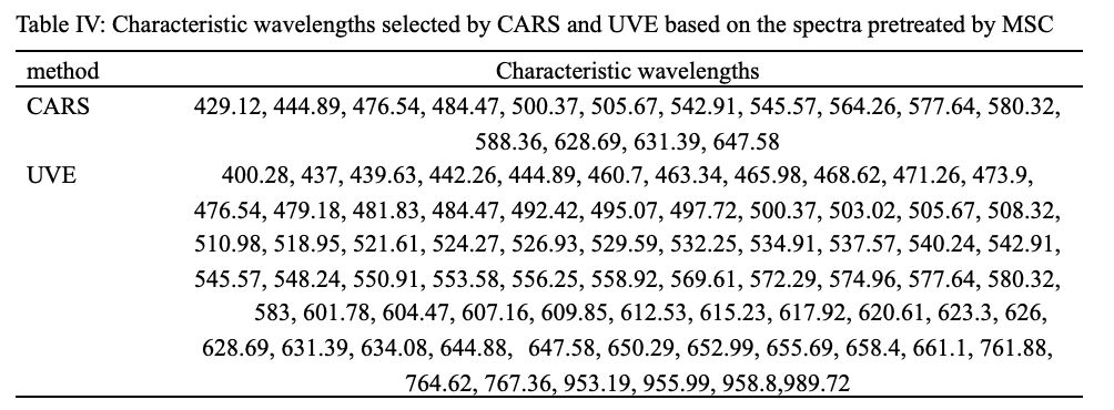 In the UVE algorithm processing, the number of optimal principal factors and random noise variables was set to 10 and 224, respectively. As shown in Figure 5b, a total of 224 variables of red line in the left region were real variables, while 224 variables of blue line in the right region were added random noise variables. The two horizontal dashed lines are the upper and lower limits of the stability of UVE variables. The variables between the two horizontal dashed lines are redundant variables that need to be deleted, while the variables beyond the two horizontal lines are important variables that need to be retained. Where, the threshold value of the two horizontal dashed lines were ±83.1622, resulting in 72 characteristic wavelengths selected, and the important wavelengths extracted are shown in Table IV. Similarly, 77 and 84 important wavelengths were selected by UVE for spectra pretreated by BL and SG, respectively.