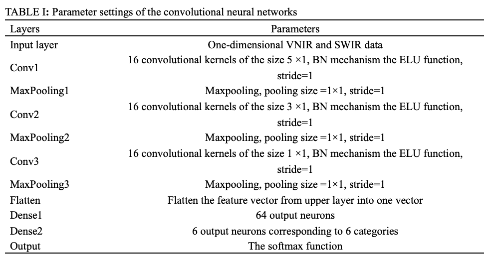 Considering VNIR and SWIR data are one-dimensional, a one-dimensional CNN was designed in this study, as shown in Figure 2. CNN contains three convolution layers with convolution kernel sizes of 5 x 1, 3 x 1, and 1 x 1. The weights of the convolution kernels are initialized by the Xavier normal initializer. After the convolution, the batch normalization mechanism is used to re-standardize the activation values of the previous layer in each batch and amplify the original reduced activation values to prevent the gradient from vanishing. The pooling layer immediately follows each convolutional layer, which reduces the output size and the risk of overfitting. The fully connected layer is then applied to extend the feature map obtained from the last convolutional layer into a one-dimensional vector and to provide input to the classifier. The number of neurons in the output layer is the category of tilapia freshness, and by connecting the Softmax classifier, the VNIR and SWIR data are classified. To reduce the risk of network over-fitting, dropout mechanisms were introduced after each convolution layer of the network. The CNN model parameters of VNIR and SWIR are the same, and the detail are shown in Table I.