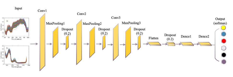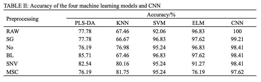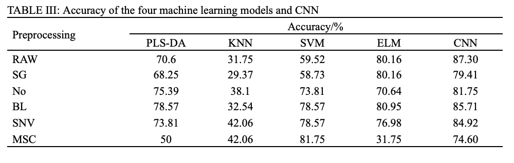 Overall, PLS-DA, KNN, SVM, and ELM models achieved satisfactory results through trial-and-error experiments, indicating that PLS-DA, KNN, SVM, and ELM models are highly dependent on the preprocessing methods. In contrary, the CNN model did not rely on data preprocessing, while achieving outstanding classification accuracy.