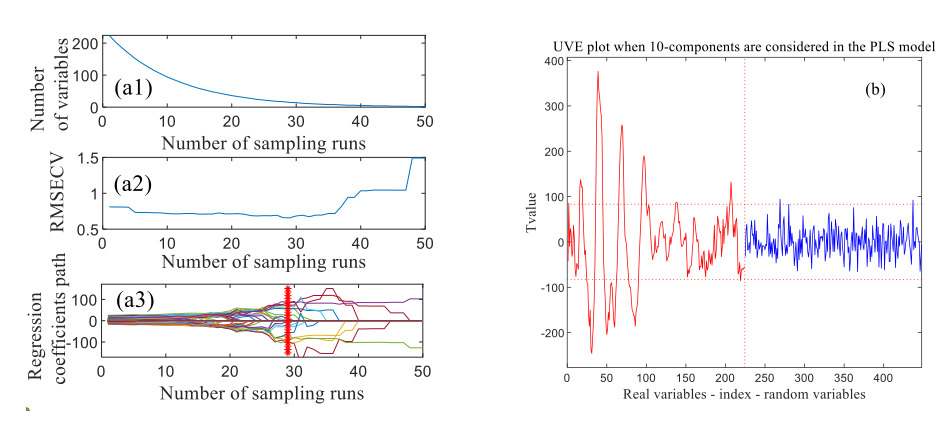 CARS is an effective wavelength selection method based on the Darwin’s evolution theory (28). The specific operation steps of CARS are summarized as follows; 1) The wavelength subsets were selected from N Monte Carlo sampling runs; 2) The important wavelengths were selected by exponential decreasing function (EDF) and adaptive reweighted sampling (ARS); 3) the wavelengths subset with the minimum cross-validation root mean square error (RMSECV) was determined as the optimal.