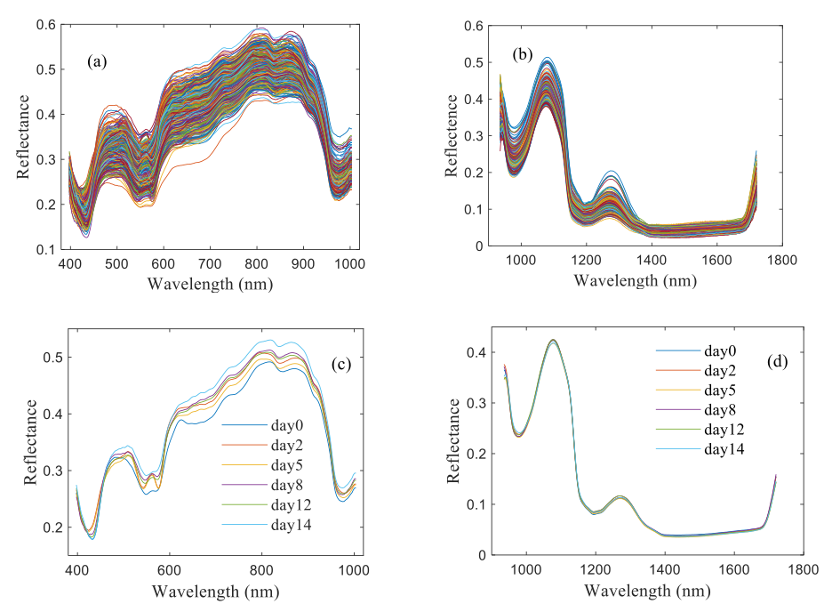 FIGURE 3: Full spectra and Average spectra of tested tilapia fillets during storage at 4 oC. (a), (c): VNIR spectra, (b), (d): SWIR spectra.