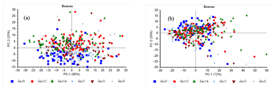 Figure 4 shows the scores plots of PC1 and PC2 of PCA for raw VNIR and SWIR spectra. In Figure 4a, PC1 and PC2 respectively contributed variances of 60% and 21%, which can explain 81% of the total variance among samples. In Figure 4b, the contribution of PC1 and PC2 is 72% and 20%, respectively. The contribution rate of cumulative variance of the two PCs is 92%. It can be found that PCA could not distinguish storage time of tilapia fillets, because raw spectra did not give any clear separations and observed clusters. Hence, it was necessary to establish more accurate discriminant model.