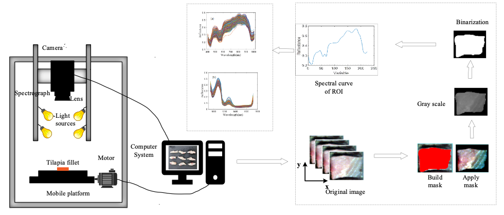 Tilapia fillets were placed on the mobile platform, and their spectral images were collected at reflectance modes. The important parameters in the VNIR-HSI were introduced as follows: Speed of the moving platform was 9.8 mm/s, height between the lens and the sample was 32 cm, exposure time was 2 min. Hyperspectral data include 224 wavelengths ranging from 397 to 1003 nm at intervals of 2.60 nm. The parameters in the SWIR-HSI were described as follows: Speed of the moving platform was 7.5 mm/s, height between the lens and the sample was 32 cm, exposure time was 1.5 min. Hyperspectral data contain 224 wavelengths ranging from 935 to 1720 nm at intervals of 1.67 nm.