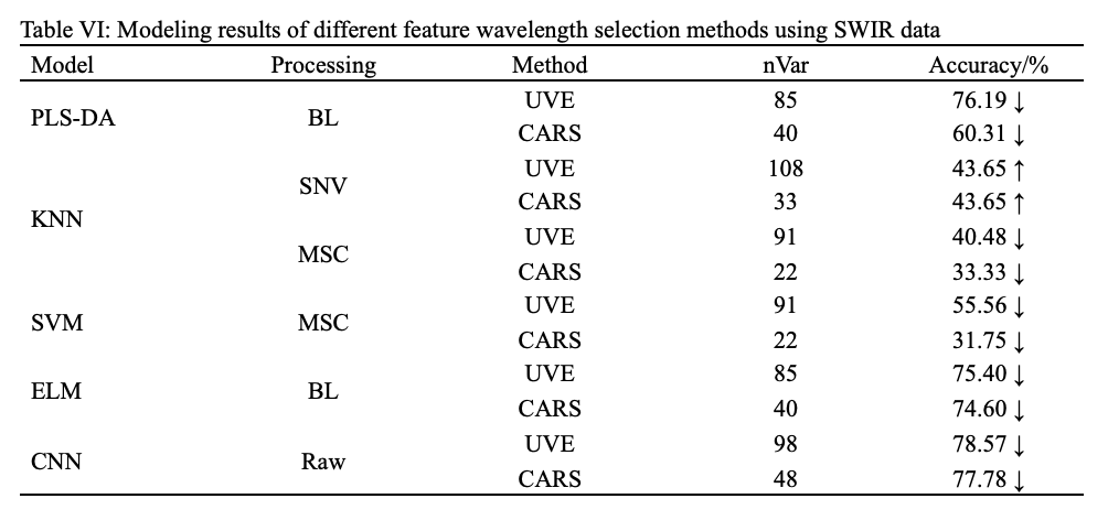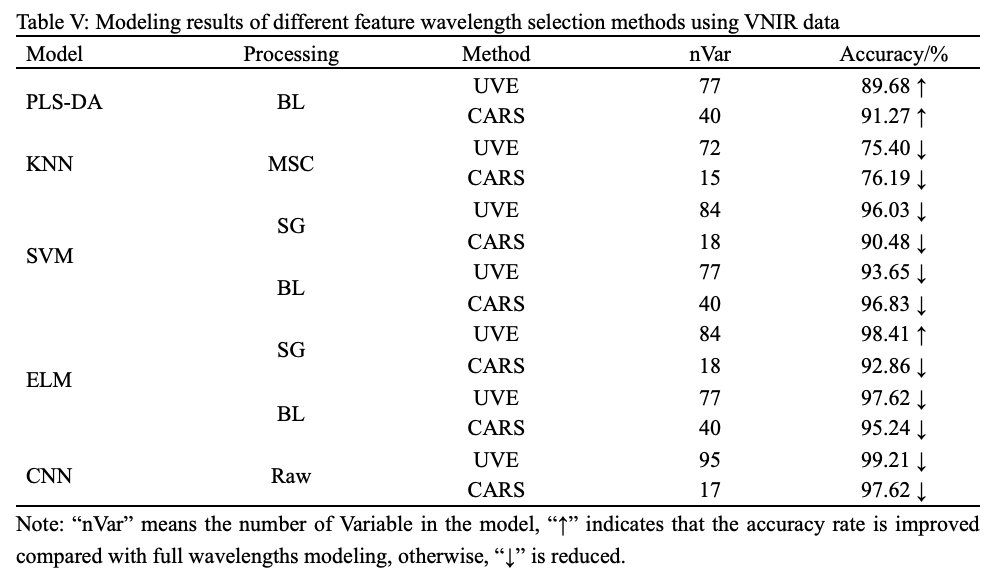 All selected characteristic wavelengths were respectively fed into PLS-DA, KNN, SVM, ELM, and CNN models to establish simplified models. Table V and VI summarized the identification results combining the selected wavelengths with PLS-DA, KNN, SVM, ELM, and CNN models.
